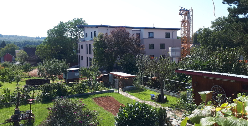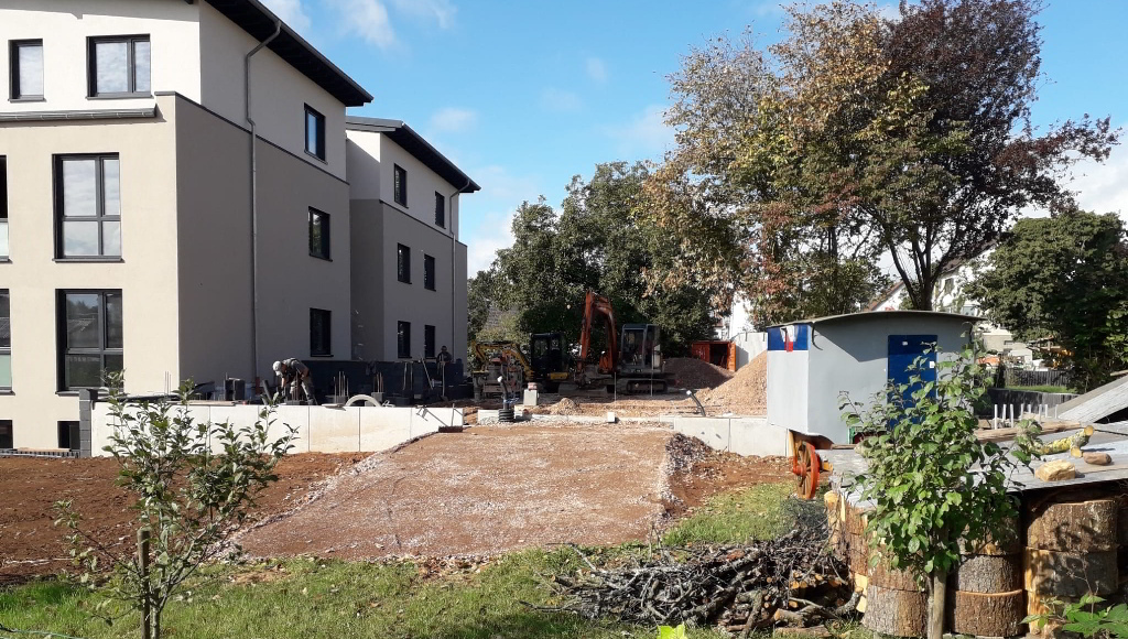 Die Bauarbeiten auf dem Nachbargrundstück schreiten voran. Der Kran wird abgebaut und die Arbeit an den Außenanlagen beginnt. |