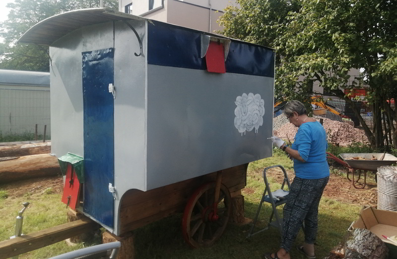 in Haus und Garten. Maria geht - neben ihrer Arbeit im Haus - wieder einer ihrer Lieblingsbeschäftigungen nach: Streichen und Malen. Den über einhundert Jahre alten Schäferwagen hat sie außen und innen renoviert. Jupp mäht mehrmals die Wiese und den Rasen uns Haus, erntet und verarbeitet Äpfel und Birnen und füllt eine 15 l Ballonflasche mit Most von unseren Trauben und hofft, dass daraus ein guter Wein reift. |