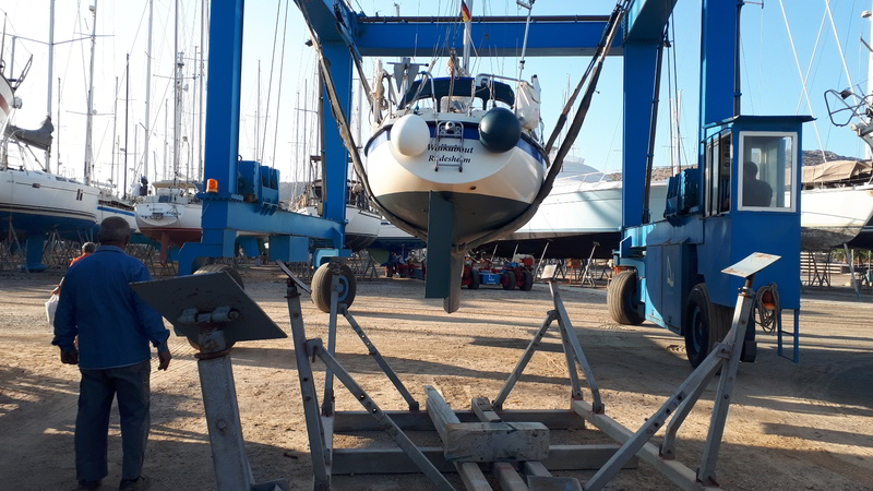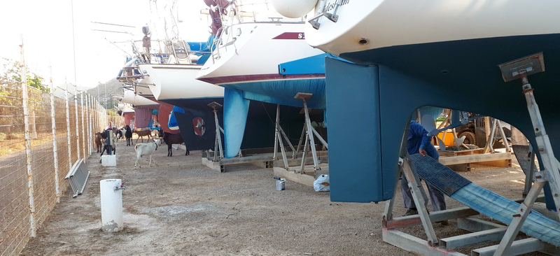 aufgerollt. Das Boot ist klar zum Einwassern. Die kleine Ziegenherde besucht uns öfters in der Marina. |