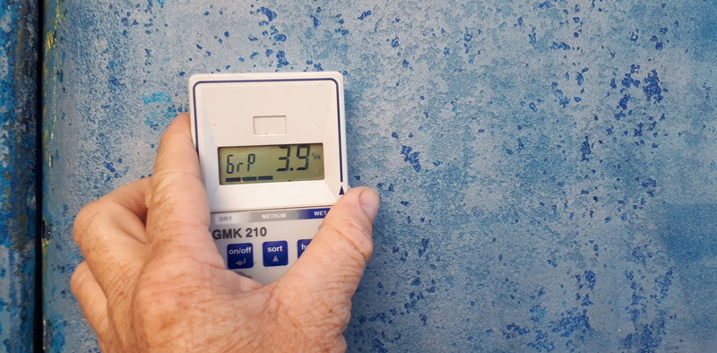 Frank leiht mir sein Feuchtemessgerät: Der Rumpf der Walkabout ist trocken und es besteht keine Gefahr von Osmose. lediglich der untere Teil des Skegs und das Ruder haben erhöhte Feuchtigkeitswerte (komischerweise an der Steuerbordseite höhere Werte als an der Backbordseite des Ruders). |
