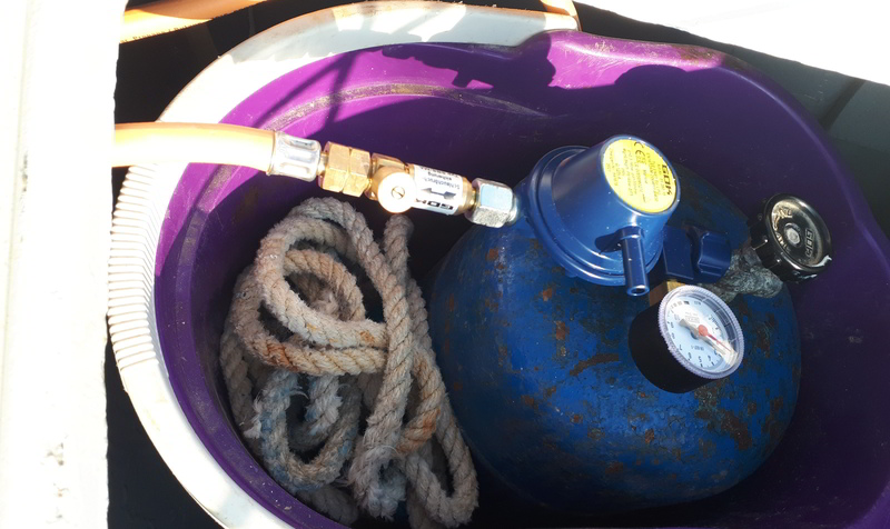Gasflasche mit neuem Regler und zusätzlicher Schlauchbruchsicherung. |