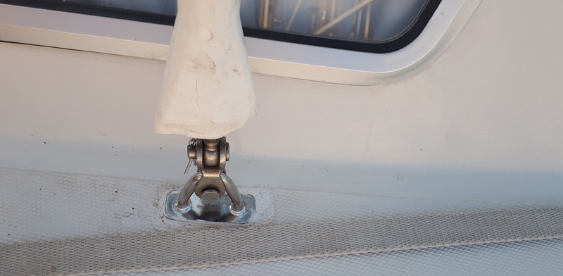 Als erstes erneuere ich das Rüsteisen, das die Backbordwant hält, und dichte das Ganze mit Sicaflex ein. |