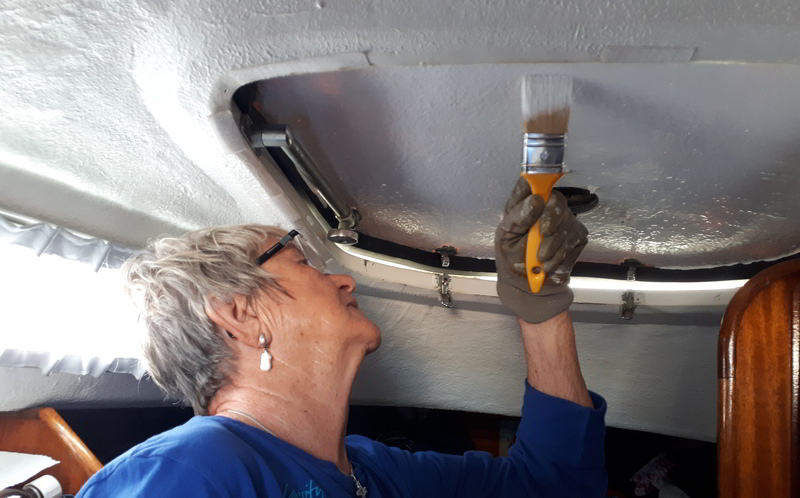 Ich erneuere die Dichtung an der Vorschiffsluke und Maria verschönert das Innere des Bootes. |
